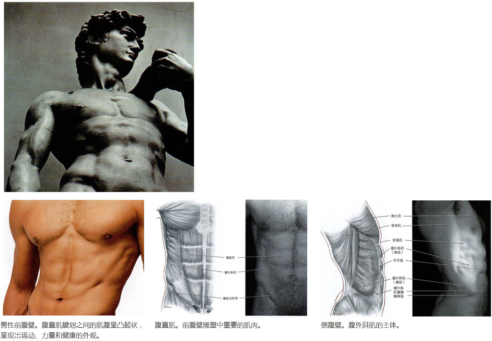 古往今来的画家和雕塑家们描绘了大量的人体形态艺术。文艺复兴时期Michelangelo的知名雕塑作品《大卫》,通过清晰可辨识的腹直肌、腹外斜肌、三角肌等肌肉轮廓,展现了男性人体的力量、活力和青春。而现实生活中很少有男性有此形态。
