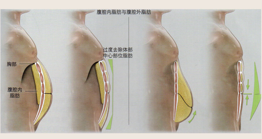 男性腹部脂肪分布 *对于超重者,手术重点是尽量去除多余脂肪,然后显露脂肪掩盖的解剖形态 *对于纤瘦或健美者,手术重点是重塑形体,而非减容