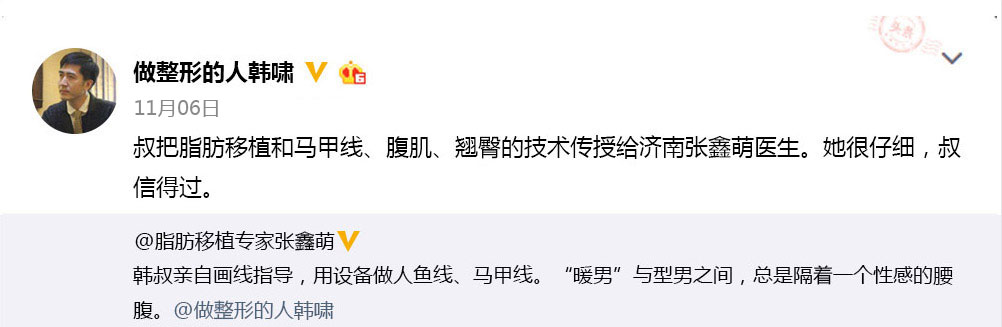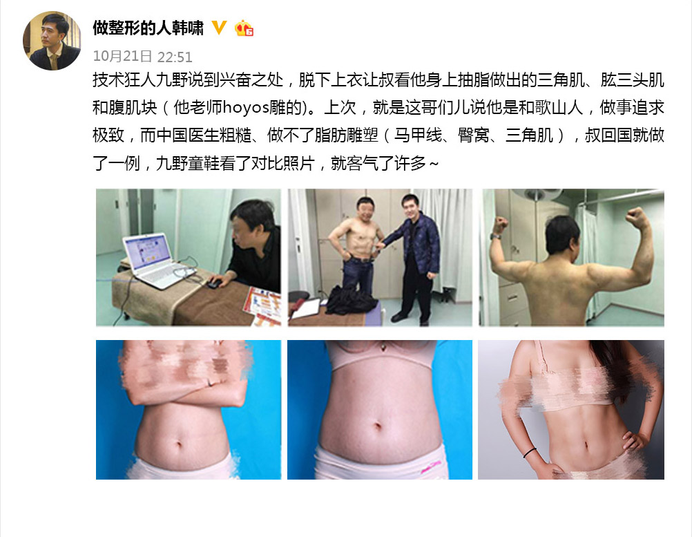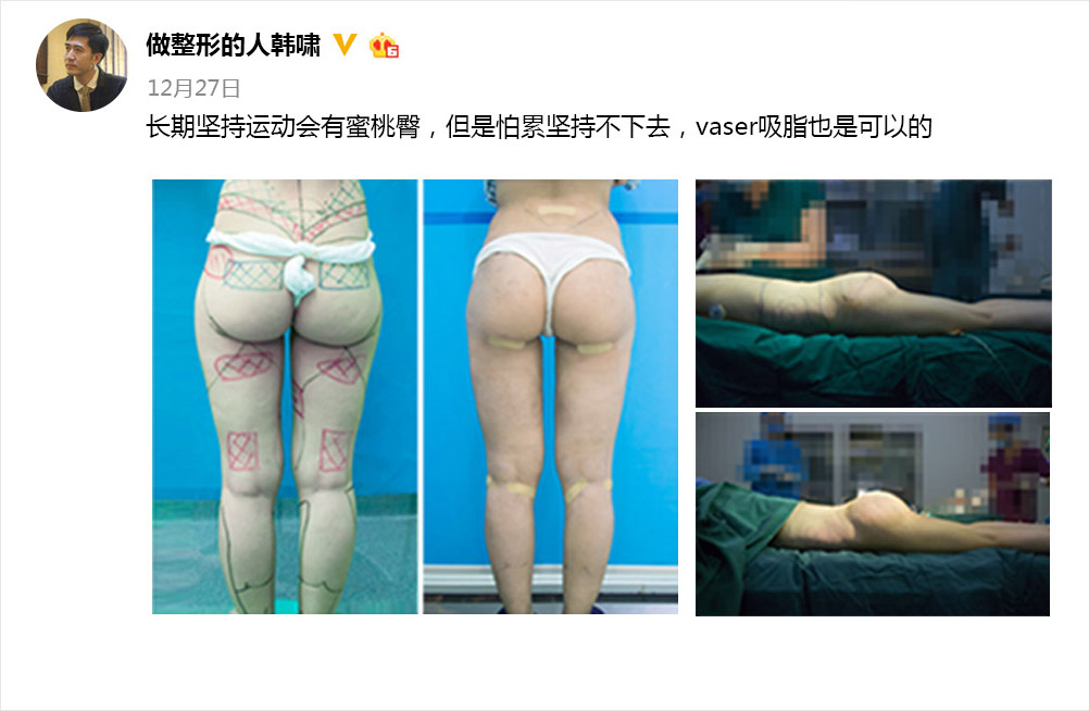 2015年韩啸医生将VASER引入中国并在专业会议上发表。有些机构声称自己也开展此项手术,并以无菌要求而拒绝你进入手术室验证,你可以要求穿隔离衣进手术室参观。同时你要求术后马甲线、人鱼线、上臂肱沟、腰窝、臀窝、大腿、小腿肌肉线条保证清晰呈现。