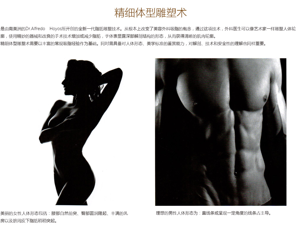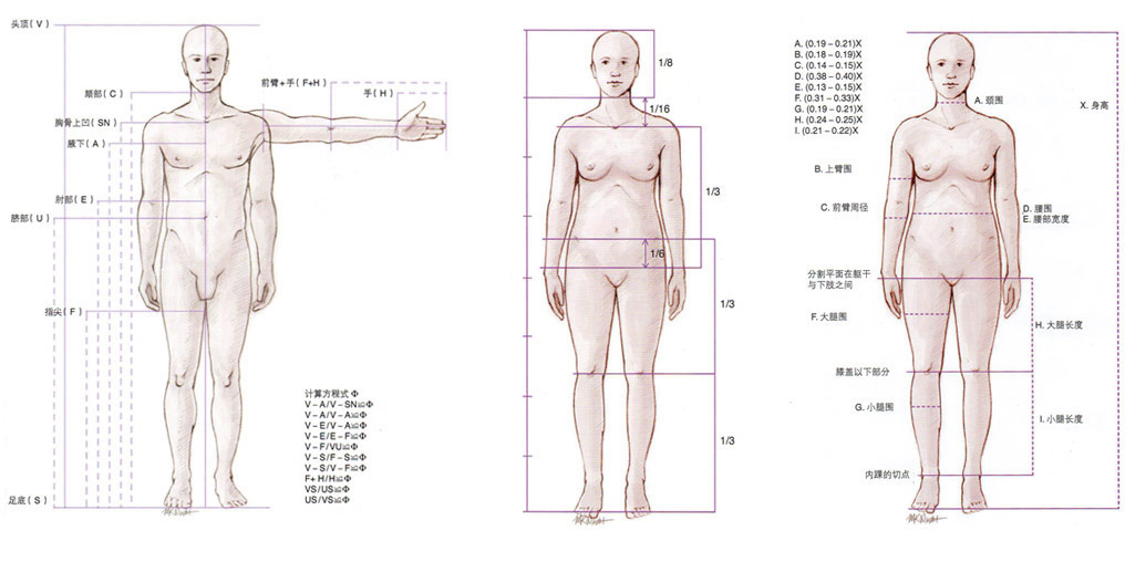 人体形态:决定人体形态、外形、大小的因素包括:深面骨骼构架、肌肉体积大小和肌张力、皮下脂肪的分布和含量。理解人体美学,不仅要了解人体的静态情况,而且要充分了解动态情况下的各种外形和线条。这些线条包括“C”形曲线、“S”形曲线和“R”形曲线。这些曲线反映了人的生理健康水平、内分泌状态、强壮及健美的外形以及寿命。