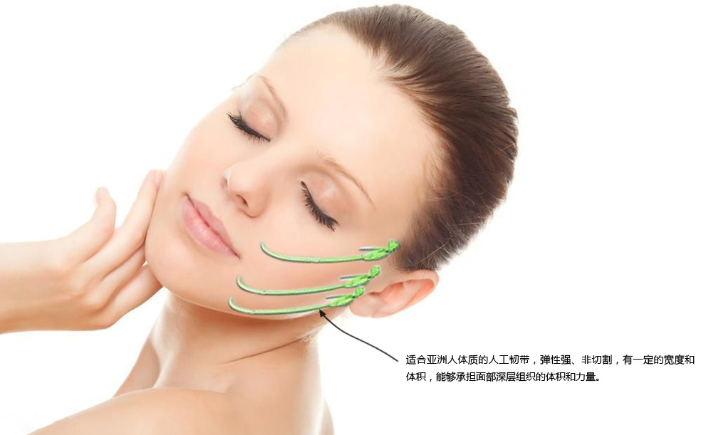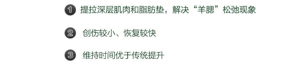 1. 提拉深层肌肉和脂肪垫,解决“羊腮”松弛现象:使用有弹性、有体积围度的人工韧带(韩叔发明并设计定制),直接提升松弛的深层肌肉和颊脂肪垫,可解决以往微拉美、锯齿线面雕,甚至大拉皮都无法纠正的“羊腮”现象,维持5年以上。TIPS:什么是“羊腮”现象?由于肌肉和颊脂垫等面颊深层组织的松垂,在口角两侧出现的囊袋状下垂,形似羊腮,因而得名。以往的大拉皮手术、微拉美、锯齿线面雕,仅能提升皮肤及筋膜,对于深层的肌肉和颊脂垫无能为力。无论如何增加拉力,即使引起口角变形、表情僵硬,都无法纠正“羊腮”现象。