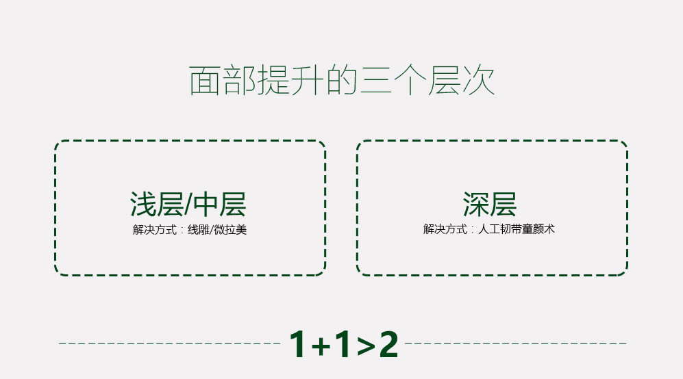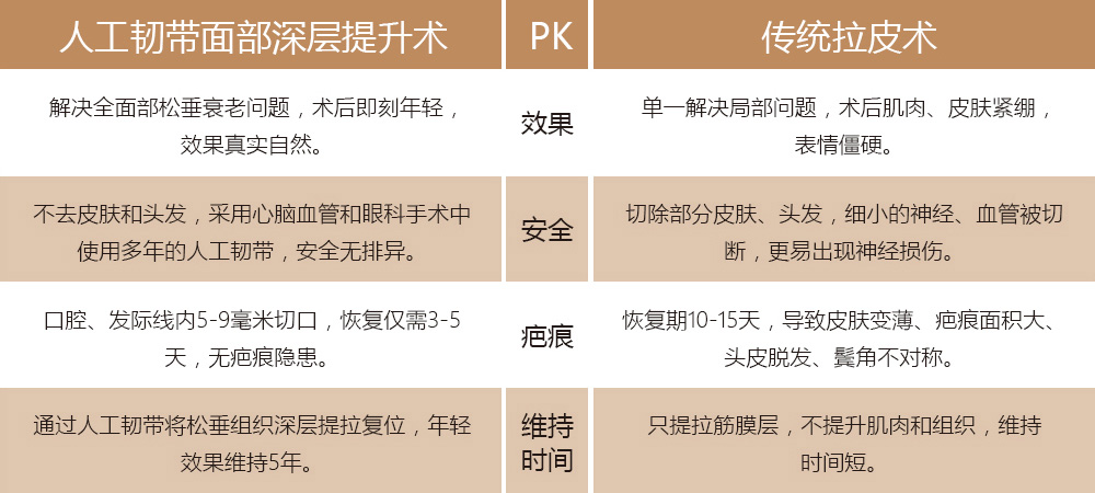 3.维持时间长:提升层次直达传统拉皮手术不可触及的肌肉、颊脂肪垫等深层组织,效果远胜于皮肤及浅层软组织的大力拉扯,维持时间长达5年。TIPS:大拉皮手术为什么只能维持1-2年?除皱提升手术效果与提升层次有极大关系。大拉皮手术提升层次仅可达到SMAS筋膜层,无法触及深层软组织,肌肉、颊脂肪垫在重力作用下仍然松垂,所以维持时间无法长久,仅可达到1-2年。而且,由于手术创伤大,破坏了皮肤组织的连续性,僵硬效果却可维持10年。同时,单一的发际线切口,距离鼻唇沟较远, 对鼻唇沟的提升效果也不明显。