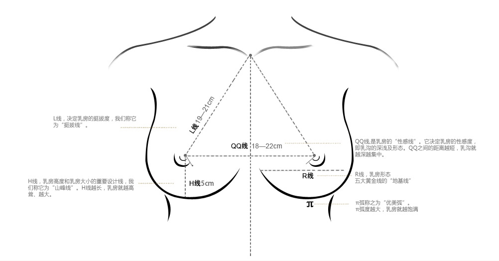 理想的乳房无论从正面还是侧面都是丰满、圆润、挺翘并富有弹性,除此之外,还应左右对称,且与身体保持和谐比例。乳糜脂肪丰胸参考国际乳房美学标准, 结合东方女性审美气质,设计出完美的乳房形态。
