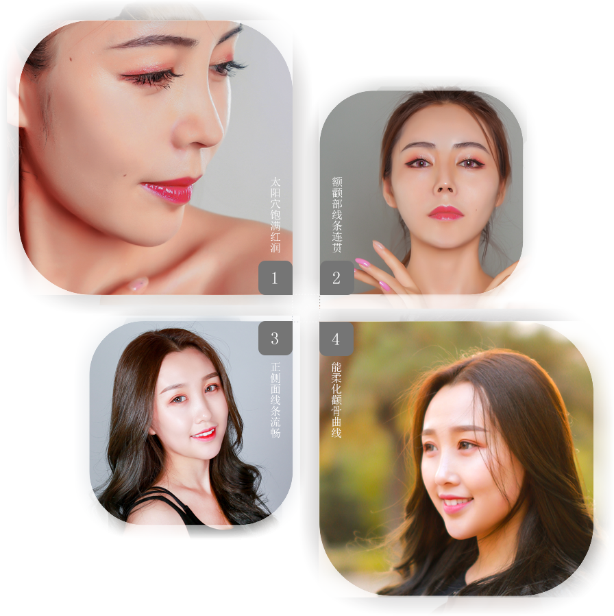 在调整太阳穴曲线的同时,与其相邻的额头、颧骨、面颊等部位的曲线也会随之受到影响